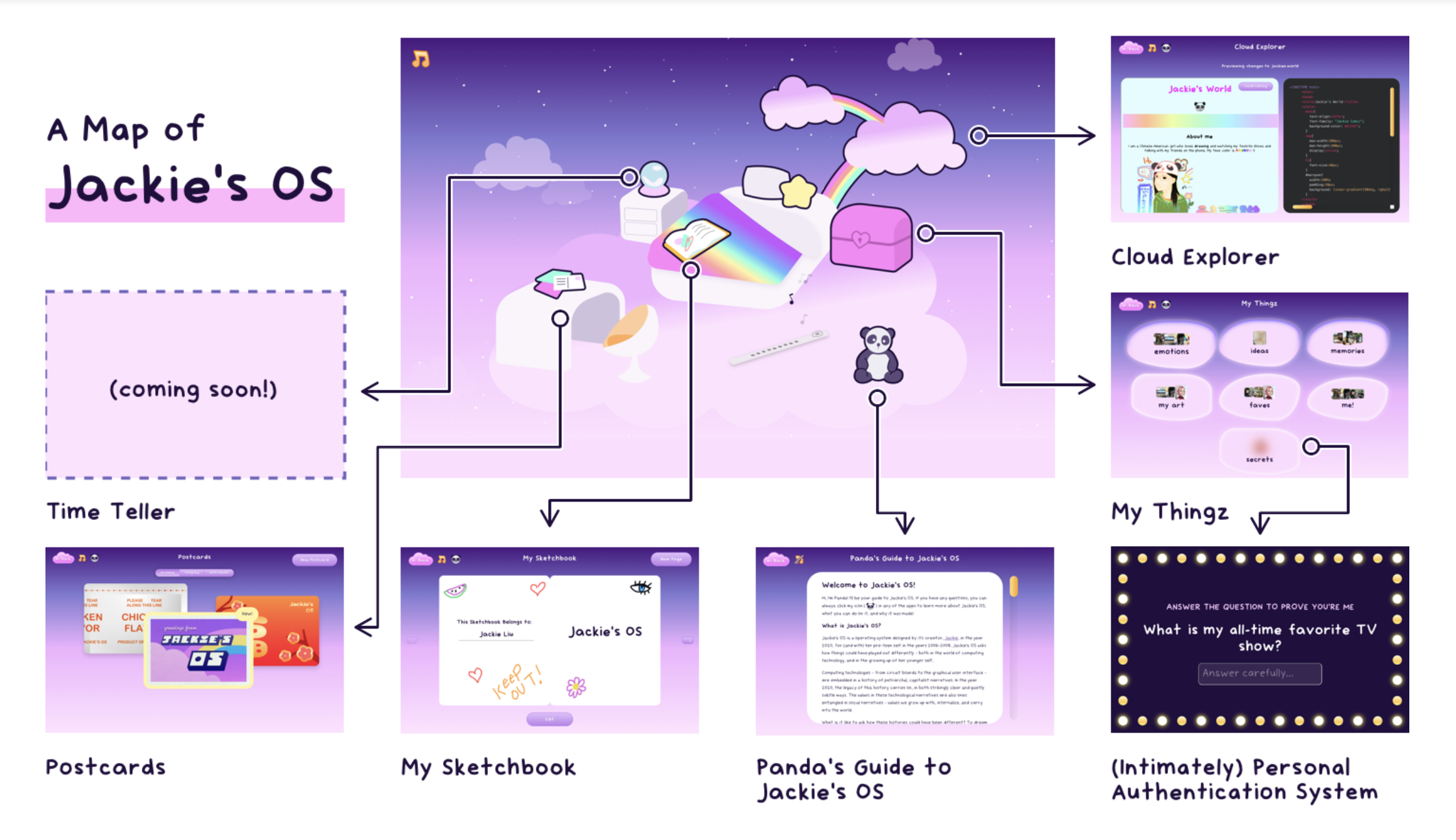 I love the work of two artists in particular who tackle this topic in their autobiographical work: Jackie Liu (@jackieis.online) and Amy Wibowo (@sailorhg), who grew up in the 1990s and early 2000s. In “Jackie’s OS”, Liu creates the desktop computer experience she wishes her childhood self could have had: one that values emotions, agency, and self acceptance. It is tender and dreamy. Wibowo’s zine “Home Sweet Homepage” describes the role that making personal websites ranging from classical music fan pages to tamagotchi guides played in her own self discovery and growth. This longing for safe and genuine self expression on the internet strikes a chord with me.