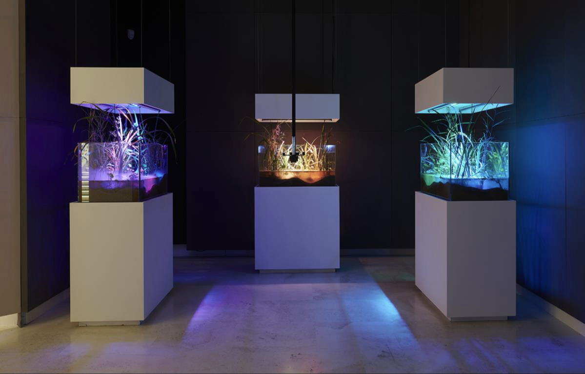 A glimpse of this can be seen in Deep Swamp, an installation made up of a triptych of semi-inundated environments that gather together wetland life forms and artificially intelligent software agents. Three AI agents, Harrison, Hands and Nicholas, use an off-the-shelf machine vision system to evaluate and manage small wetland environments that also inhabit the gallery. Each agent can change the conditions of its environment in an attempt to optimise it for a particular goal, which is set by what each system considers a wetland to be. This understanding is produced via software that is built with a machine learning tool called TensorFlow, which can be trained on custom datasets of images. The images I collected as training data are labelled and classified as different types of environments—for example, rainforests, savannas, deserts, wetlands, landscape paintings and crowds—and were collected from online image platforms like Flickr, the Google Art project, and museums with open APIs allowing access to their collections.
