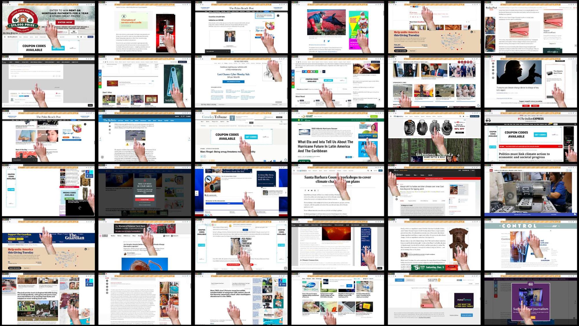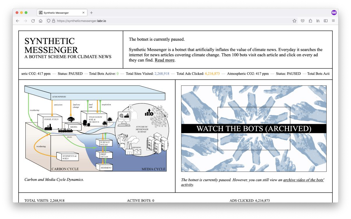 The social and cultural forces driving environmental management are also increasingly influenced by digital networks and algorithmic or AI-driven media platforms, which is the focus of Synthetic Messenger, a collaborative work I made with Sam Lavigne in 2021. Synthetic Messenger is an online intervention that questions how the business model of online media platforms influences how the climate crisis is understood. Initially launched online during the pandemic, the work consists of a group of software bots that crawl the internet looking for news on the climate crisis. When they find an article on this topic, the bots then click on all the ads that run alongside the article in an attempt to inflate both the visibility and value of the story. With each fraudulent click, a tiny payment would be triggered between advertiser and news outlet, increasing the revenue earned by the articles as well as their aggregation around the internet.